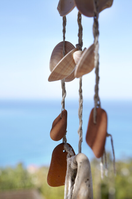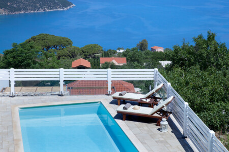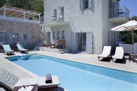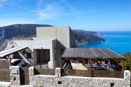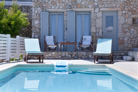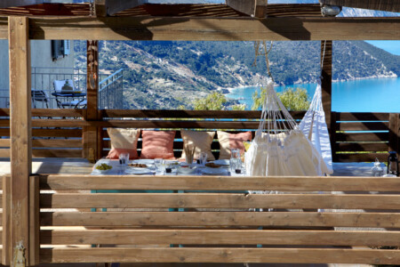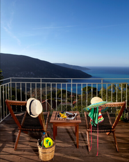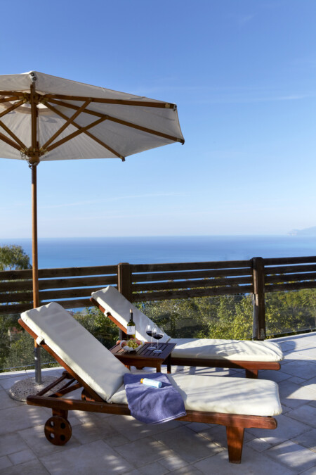 There is a lovely open-air sitting room, just above the guesthouse, with a wooden pergola and a relaxing view to the Ionian Sea. There is also a covered parking area. On the lower level, there is a pool with wooden sunbeds, umbrellas, lounge chairs, tables and, of course, the most unique view. It is the perfect spot to relax.